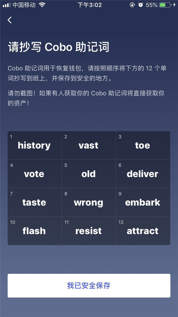备份助记词:助记词是恢复钱包的关键要素之一,请务必在安全的地方妥善保管。cobo钱包支持在“备份钱包”中定期备份助记词,以防万一。