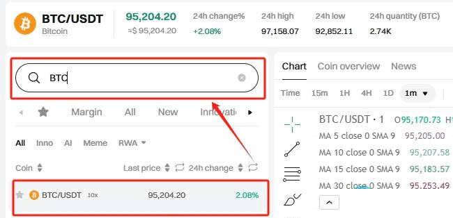 6、在搜索框输入BTC,选择BTC/USDT交易对,可以看到BTC实时行情