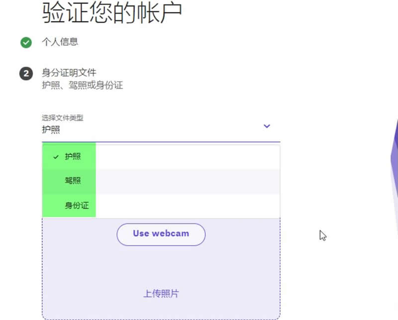 7、选择身证证明文件有护照,身份证和驾照都可以,并上传照片