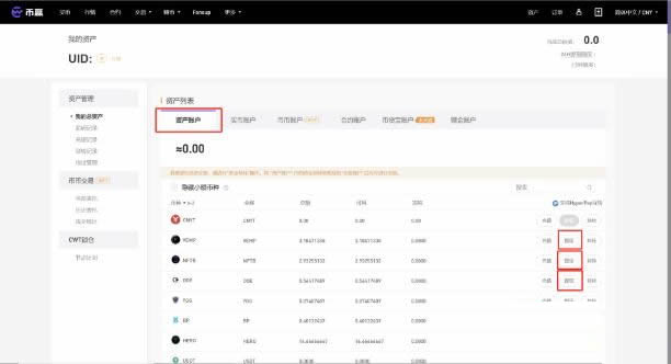 2、进入资产总览,依次选择“资产账户”,点击需要提现币种右方的“提现”按钮;