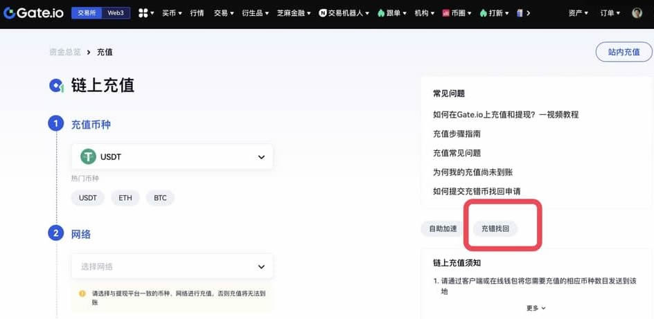 步骤一: 登录Gate.io账号,点击“资产”—“资金管理”—“充值-链上” 或访问此 链接 进行找回。