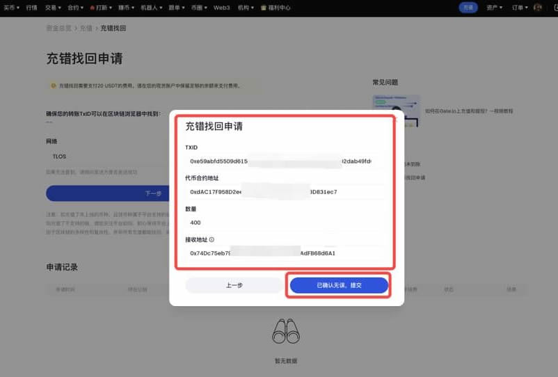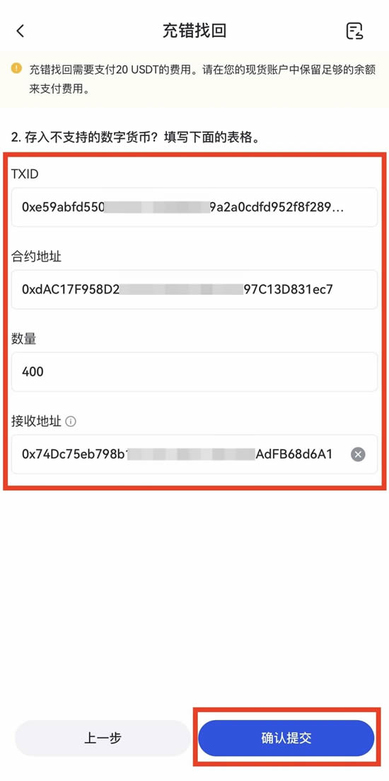 步骤五:按照页面提示填写交易ID(TXID)、合约地址、数量、接收地址等信息,核实确认无误后,点击“确认提交”即可。