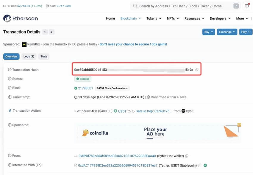 2、您的交易在区块链上的状态为“区块已确认/成功”:
