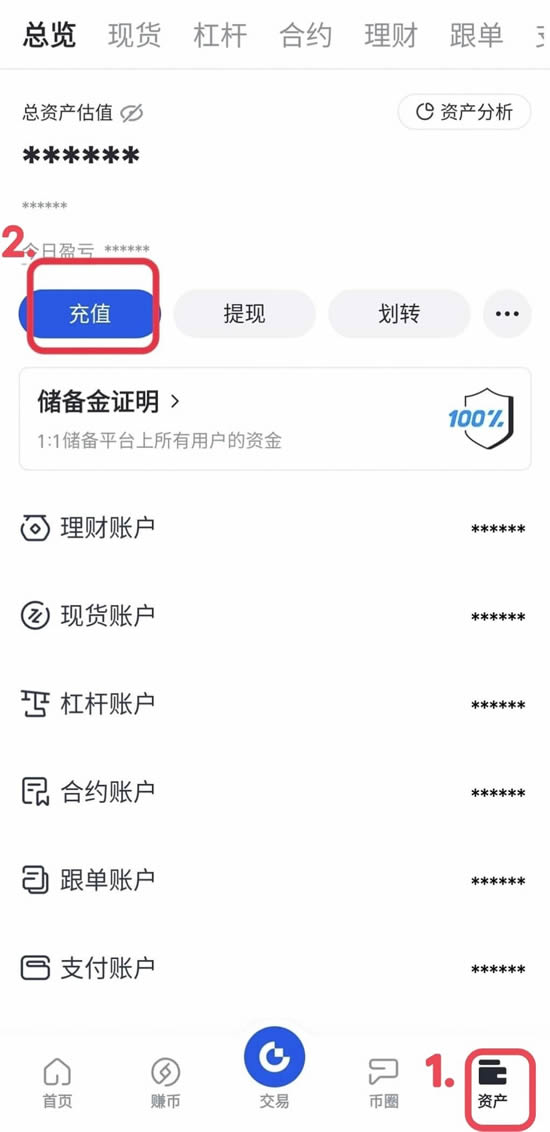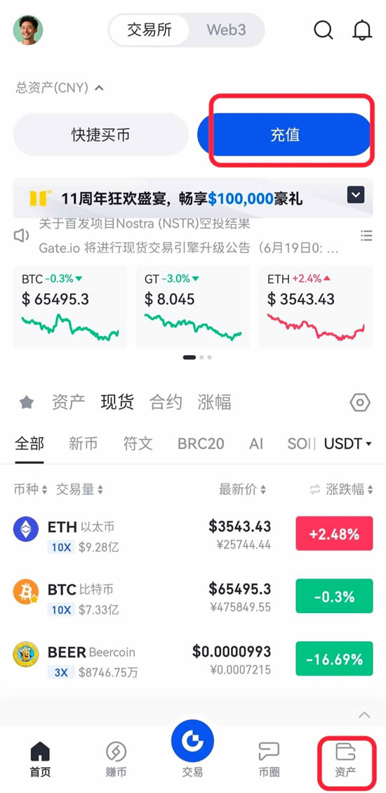 步骤一:在Gate.io App(官方注册 官方下载)登录账号,然后点击主页中的“充值”,或者点击“资产”-“充值”。