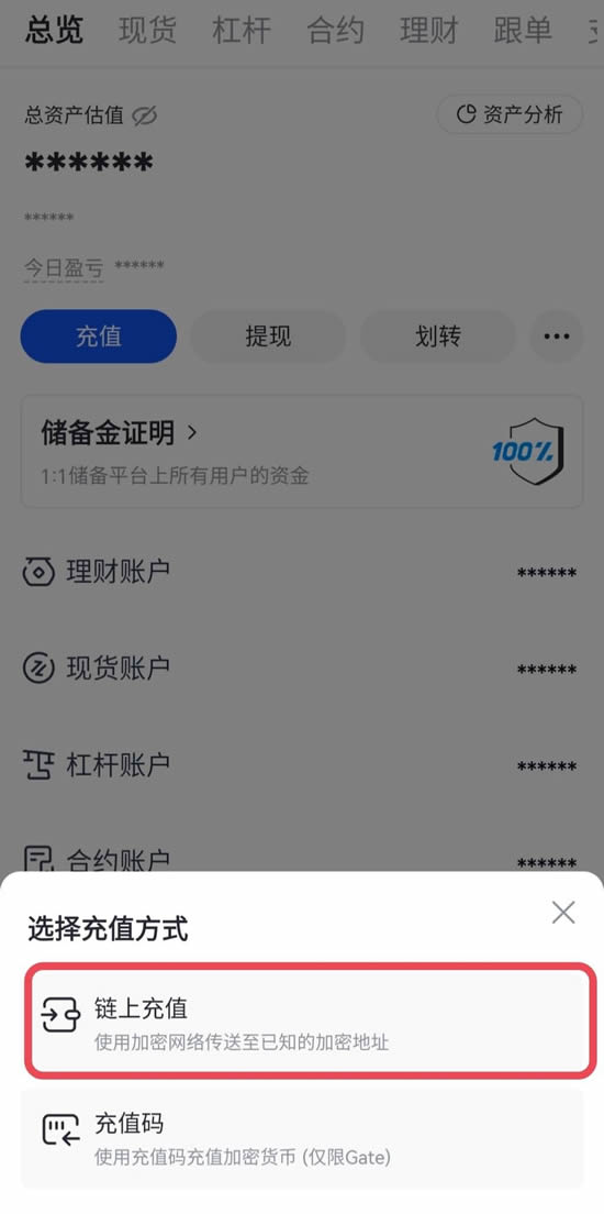 步骤二:选择“链上充值”,然后选择任意币种进入链上充值界面。