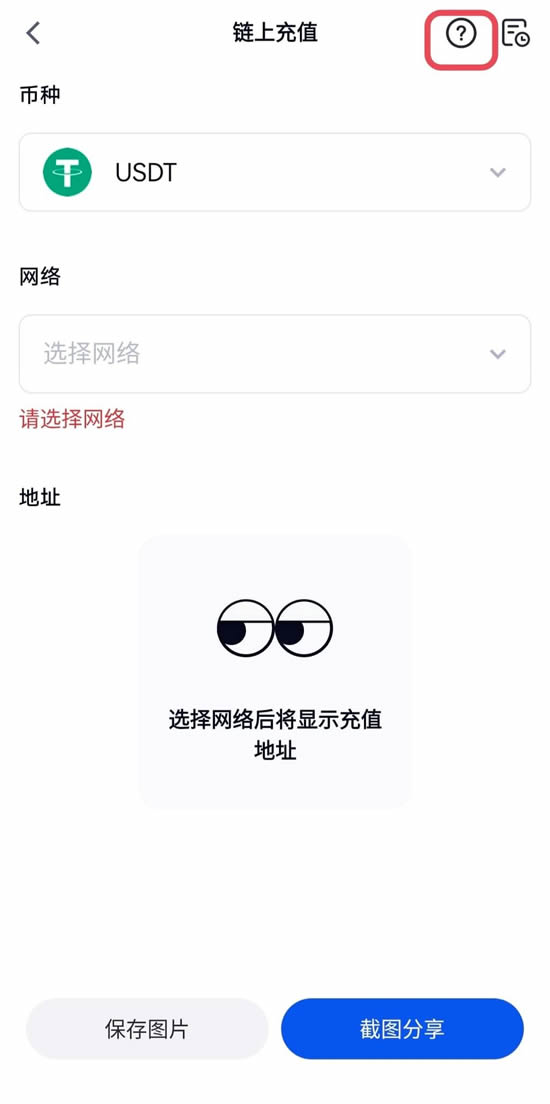 步骤三:进入链上充值界面后,点击右上角“问号”的标志,可以进入“常见问题”界面,点击“充错找回”。