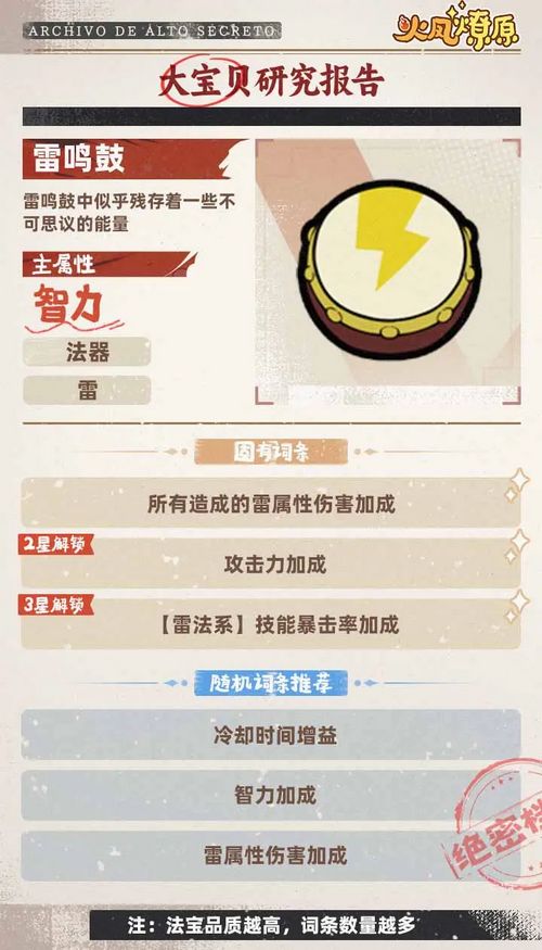 雷鸣鼓,听名字就知道是和雷系武将最为契合的法宝。固有词条也多和雷系技能有关,主公在得到它后,可以选择把它打造成一个较为通用的雷系法宝。实际上,随机词条的的刷新和法宝本身有很大的关系。比如法宝和雷系相关,那么就会更多的刷新和雷系相关的词条,主公可以根据这一点做出自己的决策。