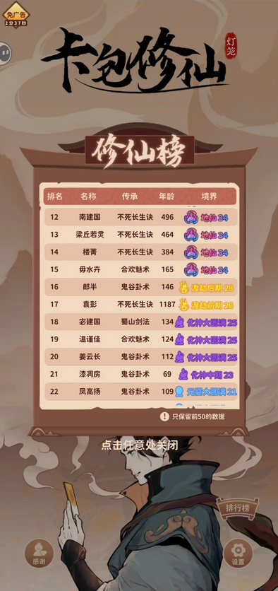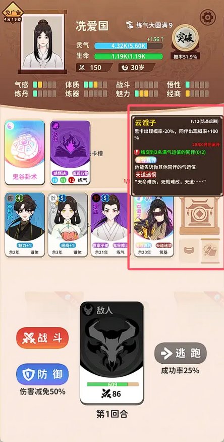 寿元耗尽或突破失败即进入轮回,保底带走“轮回点”与“上古秘卷”,可点天赋树永久加快修炼速度、提高爆率、解锁隐藏卡包——死亡越多次,下一世越爽。