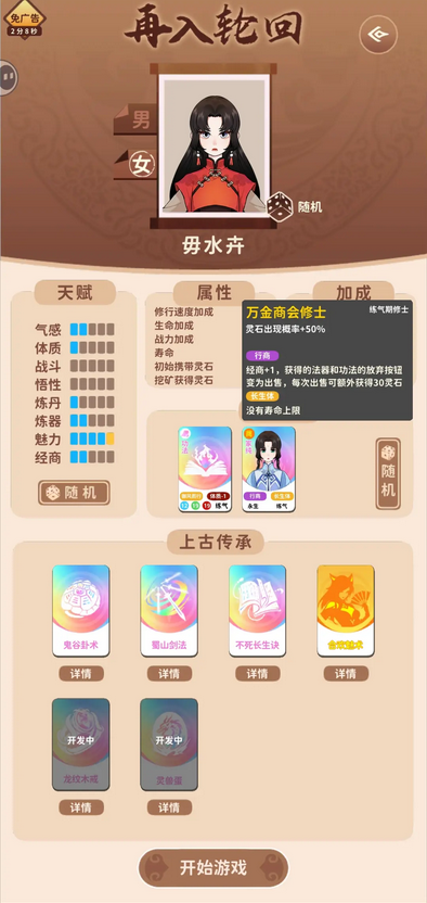 鬼谷卦术(透视卡包)、蜀山剑法(战斗爽)、不死长生诀(经商+气感速刷)、合欢魅术(道侣速成)——开局任选其一,决定整轮轮回的流派玩法。