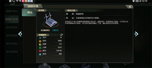 解锁建筑:施工工地上限1,发电站,补给中心,兵营上限3,突击车工厂上限1,船坞上限1,基础防御塔上限2,海上防御塔上限1