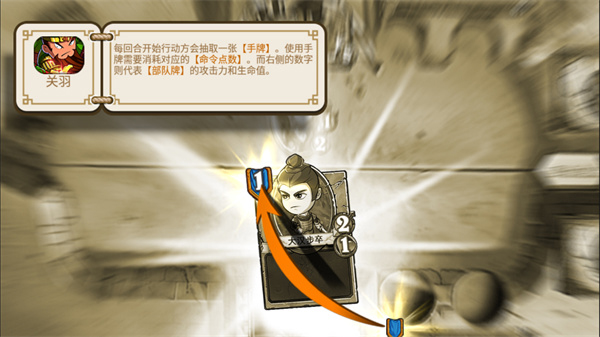 2、每轮开始时系统会自动抽取一张新手牌,使用手牌时需要消耗相应数量的命令点数。右侧的数值分别代表部队的攻击力和生命值。