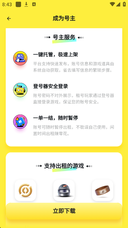 1、游戏账号租赁:提供多种游戏的账号租赁服务,包括日租、小时租等不同租赁时长,满足玩家短期体验需求;涵盖普通账号、高端账号多种类型。