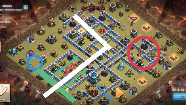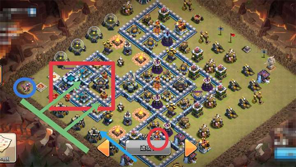 蓝箭头方向天女一路顺着打过去,篮圈冰人蛮王训练营,绿色大部队。这样一个思路的好处在于大部队直冲大本,即便不能三星也能保二。