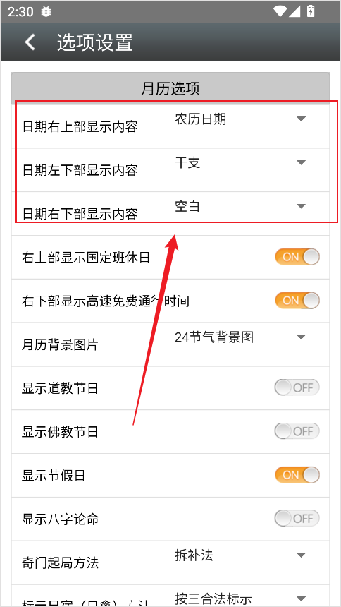 3、在设置页面中,找到顶部的“三栏日期”选项;