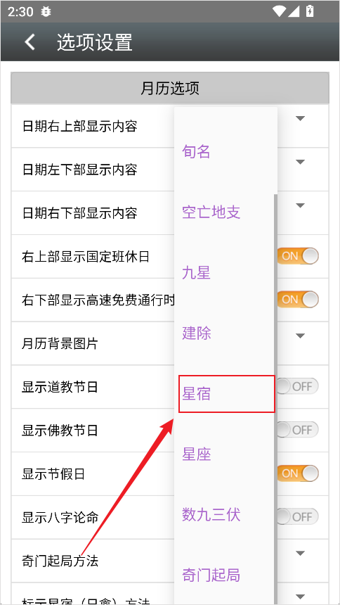 4、将其切换为【星宿】模式,即可在日历中显示每日星宿信息。