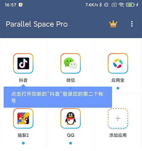 1、打开平行空间APP专业版,点击添加应用至平行空间,登录第二个账号;