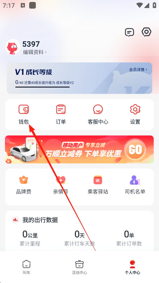 1、打开万顺叫车App,登录之后,点击【个人中心】