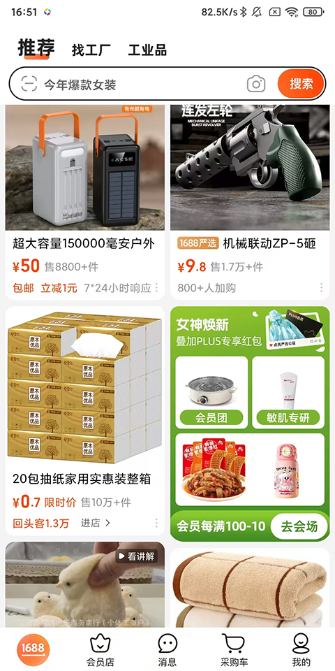 阿里巴巴1688凭借其周到贴心的服务,深受小商家的喜爱,这是一款可以用于进货的批发平台,汇聚了海量商品和好物,并且拥有各种优惠和折扣,让广大小商家用户可以用更为低廉的价格进到好货。阿里巴巴1688致力于“让天下没有难做的生意”,特地打造出了各种堪称神奇的功能,让进货更高效、更简单,让小商家们可以“从从容容,游刃有余”。如有需要,不妨下载安装试一试,告别进货时的“匆匆忙忙,连滚带爬”。