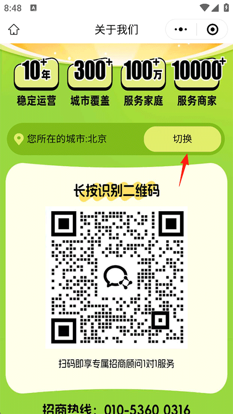 3、在跳转的 微信 小程序中切换到您所在的城市,并扫描以下二维码进行申请入驻平台。