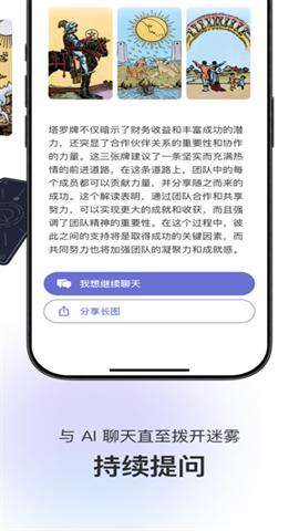 6、对话分享:支持在线分享塔罗师对话内容,还能创建新的对话在线互动,满足多样化咨询需求。
