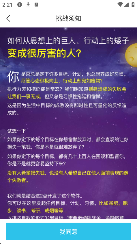 4、监督人机制:可以通过邀请好友或者平台内用户申请的方式成为你的监督人,监督人会监督你完成目标,对你给予鼓励,对你的打卡签到进行提醒,对签到内容判断是否完成目标,还能评价你的签到质量。监督人有权判断你的任务成功还是失败,有了监督人机制,任务反馈更加有效率,完成度更高。