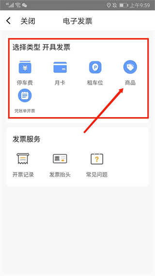 3、进入到电子发票界面,包括“停车费”、“月卡”“ 租车 位”“商品”和“凭账单开票”类型,这里以“商品”为例,