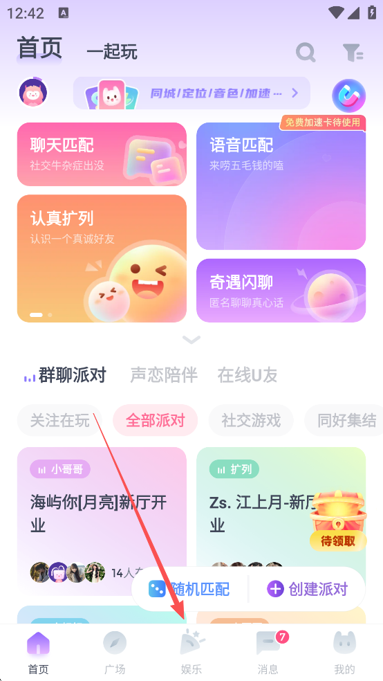 3、点击【去房间找CP】,在派对房间偶遇心动的那个ta